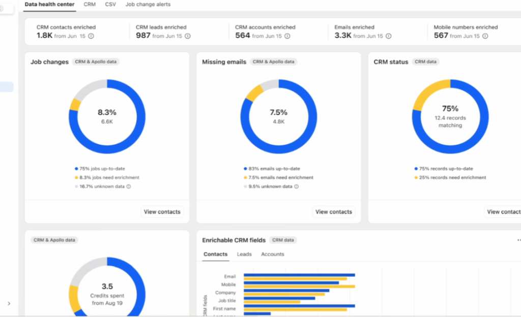 - Análisis de Señales de Intención: Apollo analiza indicadores de que un cliente potencial está interesado en un producto o servicio, como la actividad en sitios web, menciones en redes sociales y cambios en la empresa.